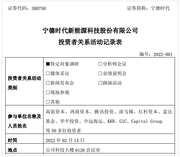 中國粉體網(wǎng)訊 2022年2月15日晚間,寧德時代發(fā)布了一份詳細的投資者關(guān)系活動記錄表。調(diào)研紀(jì)要顯示,該投資者關(guān)系活動于2月14日舉行,寧德時代方面接待人包括:董事長曾毓群、董事會秘書兼副總經(jīng)理蔣理,以及財務(wù)總監(jiān)鄭舒。