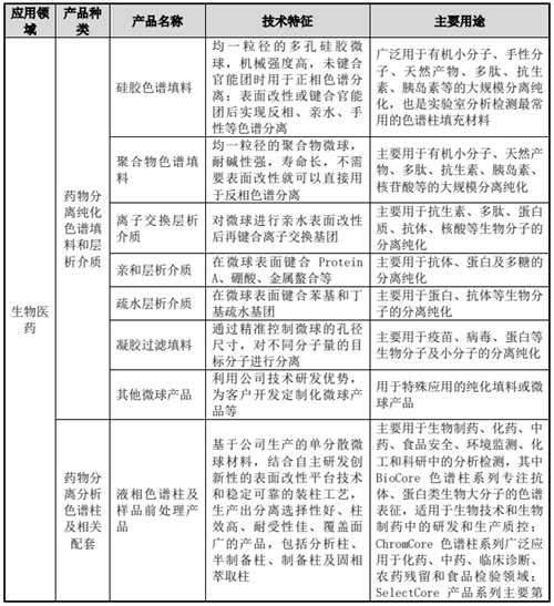 生物醫(yī)藥領(lǐng)域,公司主要為藥品大規(guī)模生產(chǎn)提供關(guān)鍵的分離純化材料,同時(shí)也為藥品質(zhì)量檢測(cè)和科學(xué)研究提供分離和分析色譜柱及相關(guān)儀器設(shè)備。