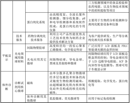 體外診斷領(lǐng)域,主要提供磁微;瘜W(xué)發(fā)光、膠乳免疫比濁、免疫熒光、核酸提取等產(chǎn)品所需的磁珠、乳膠微球、熒光微球等關(guān)鍵微球原材料。