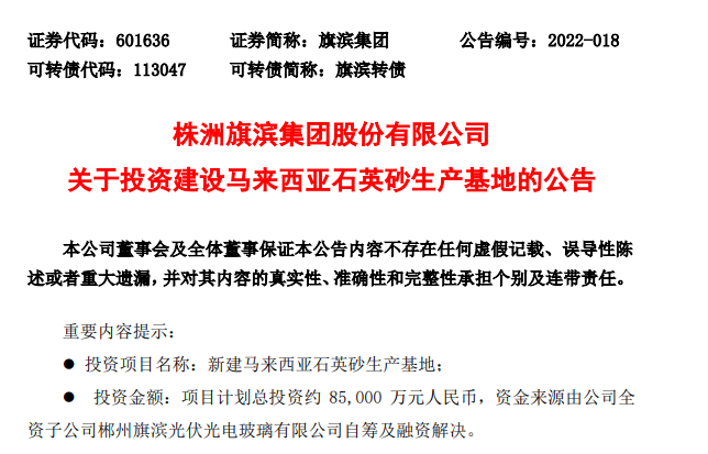 中國(guó)粉體網(wǎng)訊 3月17日,株洲旗濱集團(tuán)股份有限公司(以下簡(jiǎn)稱“旗濱集團(tuán)”)發(fā)布公告稱,為保障海外光伏玻璃生產(chǎn)線的用砂需求和供應(yīng)安全,延伸和打造一體化產(chǎn)業(yè)鏈,公司決定同步在馬來西亞沙巴州投資建設(shè)石英砂生產(chǎn)基地。