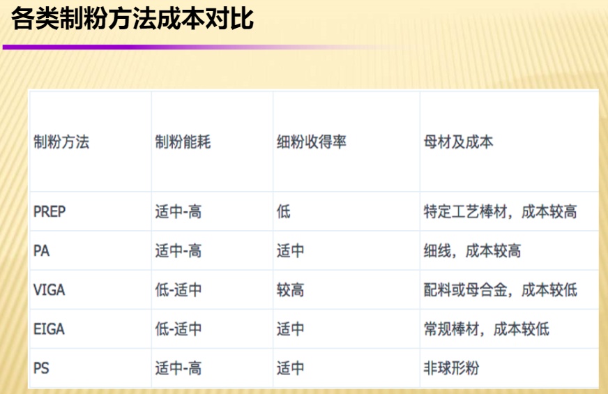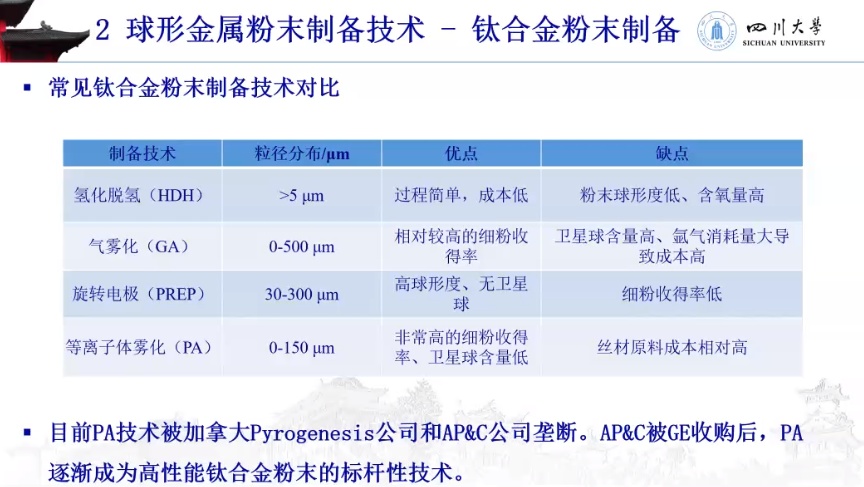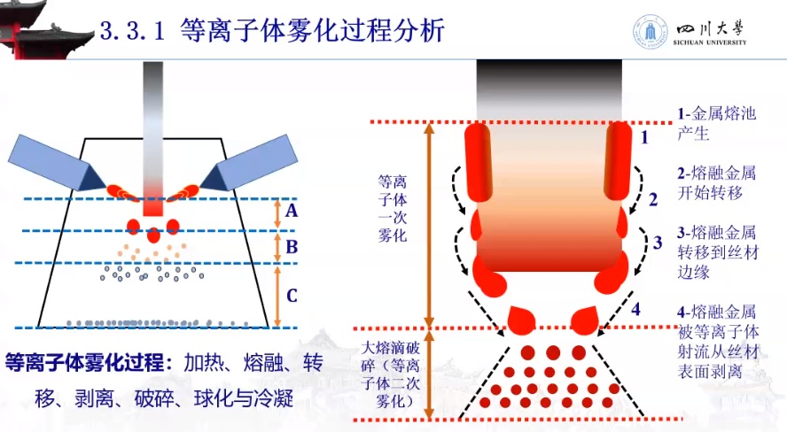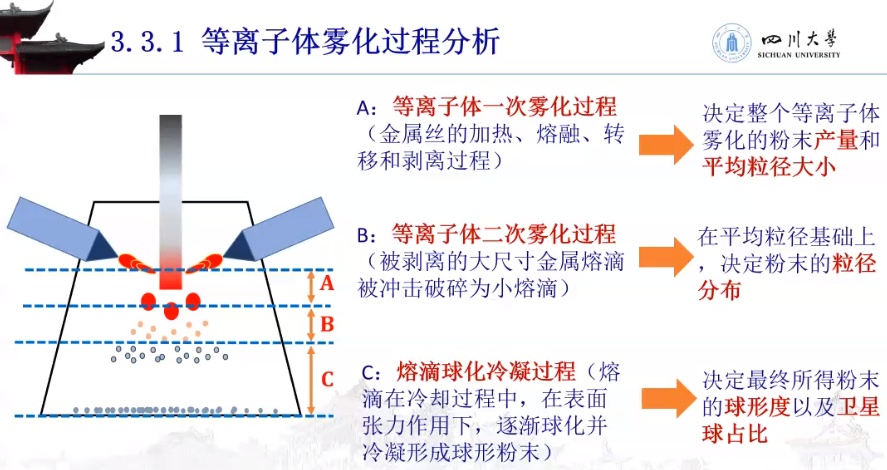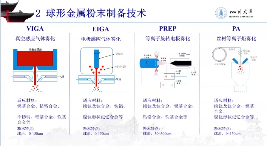 接下來,余德平教授以鈦合金粉末為例,詳細(xì)講解了球形金屬粉末的幾種制備技術(shù),主要包括真空感應(yīng)氣體霧化(VIGA)、電極感應(yīng)氣體霧化(EIGA)、等離子旋轉(zhuǎn)電極霧化(PREP)、絲材等離子炬霧化(PA)。