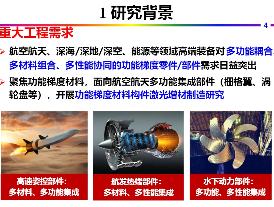馬教授首先講述了功能梯度材料激光增材制造技術(shù)的研究背景,主要包括功能梯度材料的應(yīng)用、功能梯度材料的定義與特性等。