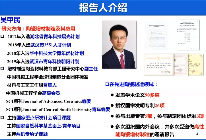 4來自華中科技大學(xué)的吳甲民副教授為大家?guī)眍}目為《陶瓷增材制造及其應(yīng)用研究進(jìn)展》的報(bào)告。