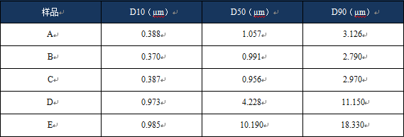 從表1中可以看出,樣品A、B、C三種的平均粒徑在1 μm左右,是較為理想的指標(biāo),樣品D的平均粒徑在4 μm,超過理想的粒度指標(biāo),而樣品E的平均粒徑超過10 μm,極可能影響鋰離子在電極活性材料中的固相擴(kuò)散,進(jìn)而降低電池的有效放電量。