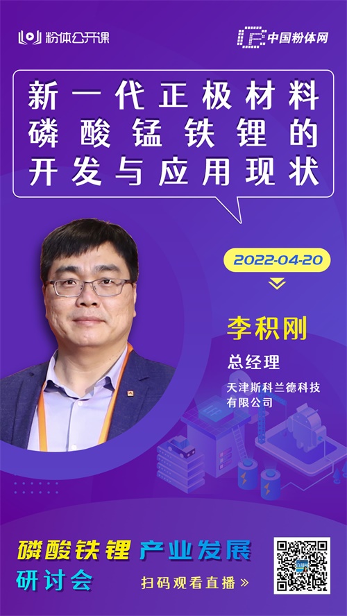 隨著產(chǎn)品和技術(shù)的不斷成熟,磷酸錳鐵鋰產(chǎn)業(yè)有望獲得快速發(fā)展。為了解行業(yè)最新動(dòng)態(tài),中國(guó)粉體網(wǎng)旗下粉體公開(kāi)課平臺(tái)將于4月20日線上舉辦“磷酸鐵鋰產(chǎn)業(yè)發(fā)展研討會(huì)”,屆時(shí)將邀請(qǐng)來(lái)自天津斯科蘭德科技有限公司的李積剛總經(jīng)理作《新一代正極材料磷酸錳鐵鋰的開(kāi)發(fā)與應(yīng)用現(xiàn)狀》報(bào)告。報(bào)告人將介紹公司團(tuán)隊(duì)在磷酸錳鐵鋰方面的研究開(kāi)發(fā)和產(chǎn)業(yè)化推廣應(yīng)用,使這種高能量密度的無(wú)鈷無(wú)鎳無(wú)貴金屬的廉價(jià)動(dòng)力電池材料成為可能。