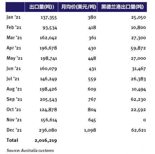 根據(jù)澳大利亞的貿(mào)易數(shù)據(jù),受主要下游行業(yè)強勁需求的推動,2021年,澳大利亞的鋰精礦(鋰輝石)出口達到200萬噸。中國是最大的進口國,占總出貨量的95.8%,其次是比利時2.4%,美國和韓國分別為0.9%和0.8%。2021年澳大利亞鋰輝石的平均出口價格為602美元/噸,從去年1月的平均380美元/噸升至12月的1098美元/噸。2021年,西澳大利亞黑德蘭港出口了37萬噸鋰輝石,同比幾乎持平,占該國出口量的18%。