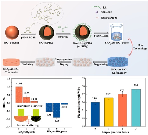 具體方法上,研究組采用聚多巴胺對(duì)熔融石英(SiO2)陶瓷進(jìn)行表面包覆改性,取代了傳統(tǒng)光固化成型膏料制備所需的分散劑和吸光劑,制備了基于光固化成型(SLA)技術(shù)的SiO2f/m-SiO2陶瓷膏料。所制備的SiO2f/m-SiO2陶瓷膏料具有優(yōu)異的流變特性和更高的成型精度。采用光固化成型結(jié)合硅溶膠浸漬技術(shù)對(duì)SiO2f/m-SiO2復(fù)合陶瓷進(jìn)行浸漬處理對(duì)SiO2f/m-SiO2復(fù)合陶瓷的力學(xué)性能進(jìn)行改善。結(jié)果表明,當(dāng)浸漬次數(shù)為3次時(shí),SiO2f/m-SiO2復(fù)合陶瓷的力學(xué)性能得到較大提升,其中彎曲強(qiáng)度增幅約20.4%,壓縮強(qiáng)度增幅約42.0%。