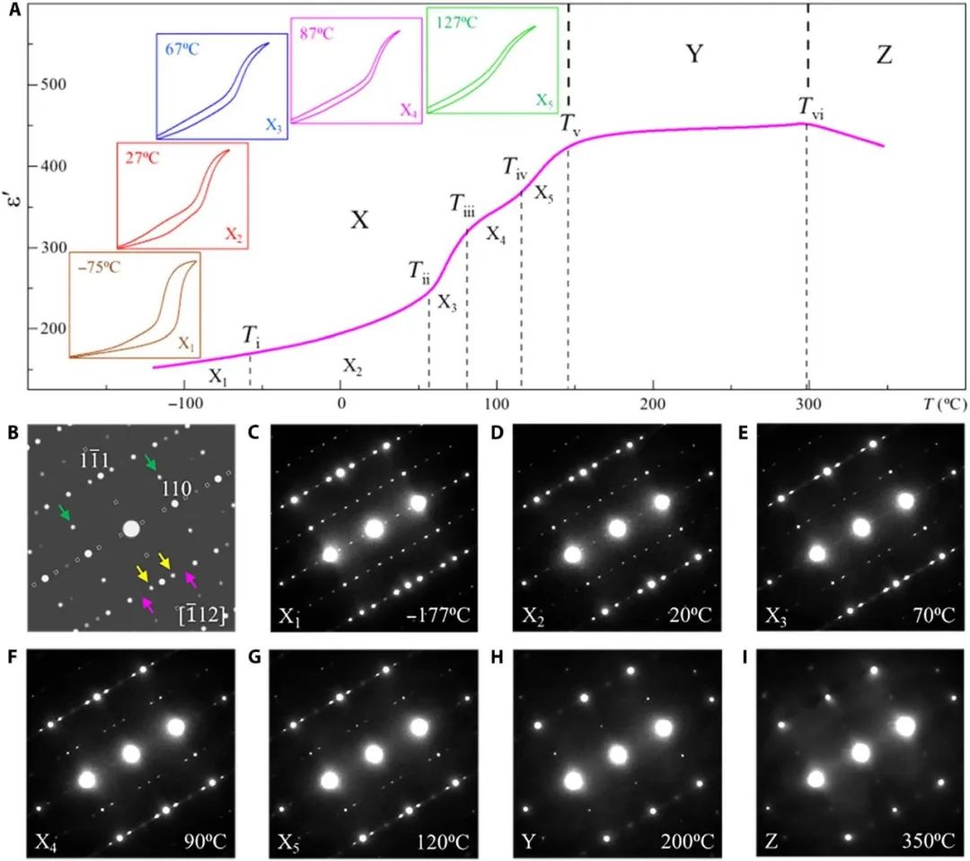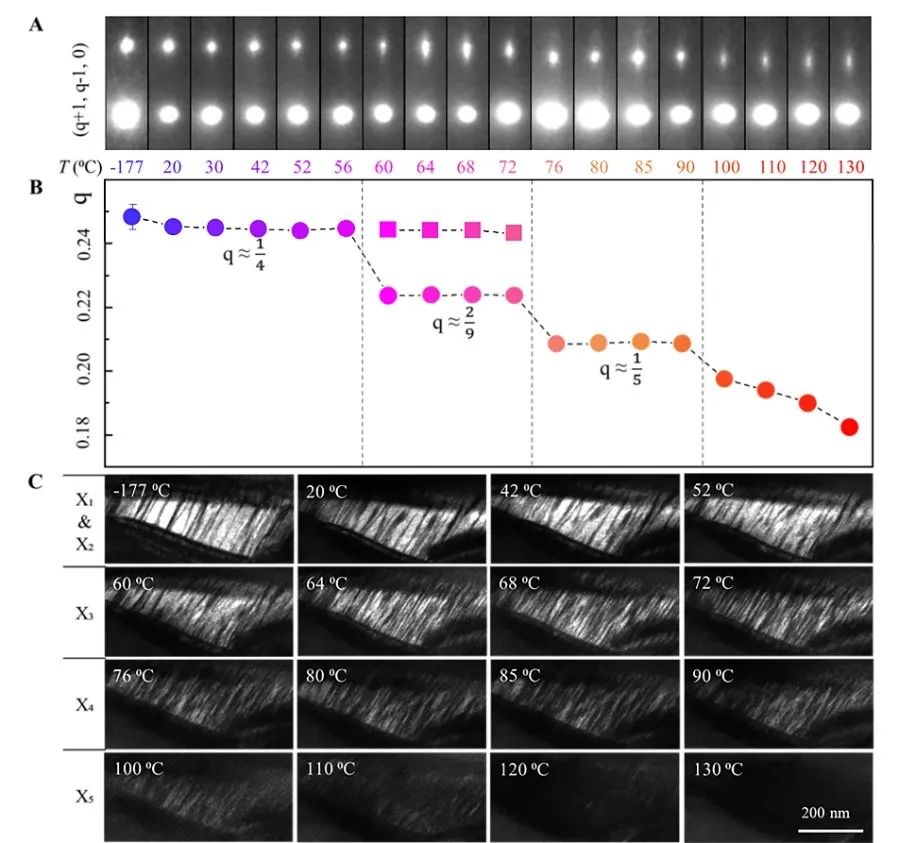 針對(duì)這一問(wèn)題,中國(guó)科學(xué)院上海硅酸鹽研究所許鈁鈁研究員帶領(lǐng)的材料透射電鏡顯微結(jié)構(gòu)表征團(tuán)隊(duì)和王根水研究員帶領(lǐng)的鐵電陶瓷材料與器件研究團(tuán)隊(duì)深入合作,綜合利用原位變溫透射電鏡技術(shù)和電學(xué)性能表征等手段對(duì)傳統(tǒng)(Pb0.97La0.02)(Zr0.50Sn0.50)O3(PLZS)反鐵電陶瓷開展了溫致相變儲(chǔ)能及其結(jié)構(gòu)演變的微觀機(jī)制研究。研究發(fā)現(xiàn),PLZS反鐵電陶瓷從-177 °C到350 °C的相變過(guò)程表現(xiàn)為反鐵電相—多胞順電相—簡(jiǎn)單順電相的系列轉(zhuǎn)變,并首先在反鐵電溫區(qū)范圍內(nèi)發(fā)現(xiàn)由多個(gè)等周期臺(tái)階組成的多晶型轉(zhuǎn)變,這一現(xiàn)象在凝聚態(tài)物理領(lǐng)域被稱為“魔梯(devil’s staircase)”,即調(diào)制結(jié)構(gòu)的調(diào)制周期隨溫度呈現(xiàn)臺(tái)階式變化。深入的結(jié)構(gòu)分析表明魔梯現(xiàn)象起源于材料中鐵電序構(gòu)和反鐵電序構(gòu)的相互競(jìng)爭(zhēng)。并且,將這種相互競(jìng)爭(zhēng)作用解耦成基本結(jié)構(gòu)函數(shù)s(r)和調(diào)制結(jié)構(gòu)函數(shù)f(r),就可以實(shí)現(xiàn)魔梯各臺(tái)階中極化序構(gòu)sm(r)的定量描述,即sm(r) = s(r)+f(r) [s(r) = k,f(r) = Asin(2πqr+φ)]。由于魔梯各臺(tái)階中存在大量等周期的極化序構(gòu)轉(zhuǎn)變,具有“魔梯”結(jié)構(gòu)就可以延緩性能隨溫度的改變,從而實(shí)現(xiàn)溫度穩(wěn)定性與儲(chǔ)能特性的協(xié)同優(yōu)化,使得PLZS陶瓷在-55~85 °C工作溫度范圍內(nèi)儲(chǔ)能密度在8.0~6.5 J/cm3間變化,變化率小于15%,儲(chǔ)能效率均高于83%(工作電場(chǎng)310 kV/cm),展現(xiàn)出良好的溫度穩(wěn)定性,達(dá)到X5R電容器的溫度穩(wěn)定性要求。