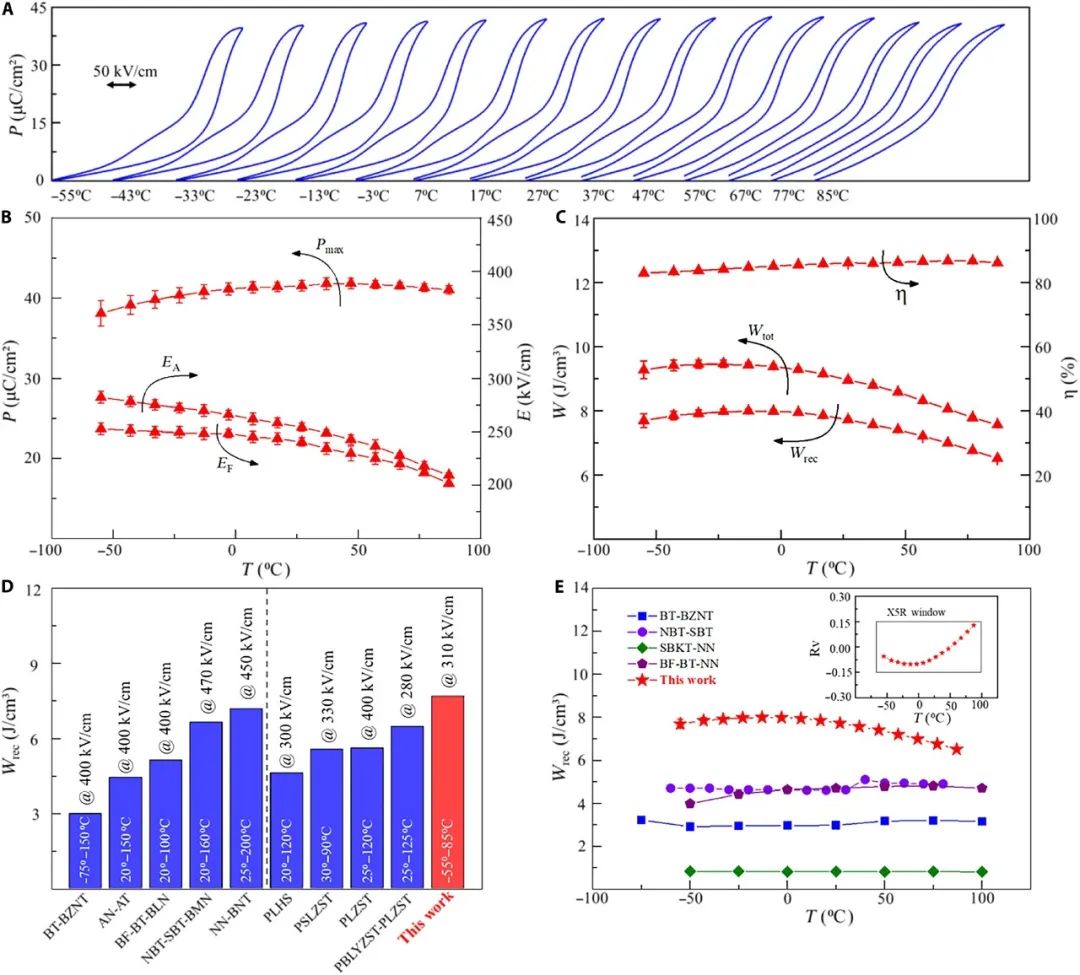 中國(guó)粉體網(wǎng)訊 脈沖功率技術(shù)可以在極短的時(shí)間內(nèi)釋放兆瓦級(jí)功率的電能量,在國(guó)家安全和國(guó)民經(jīng)濟(jì)等領(lǐng)域都具有廣泛的應(yīng)用。脈沖電容器是脈沖功率技術(shù)的關(guān)鍵儲(chǔ)能部件,它的性能表現(xiàn)對(duì)脈沖功率裝置的輕量化和小型化至關(guān)重要。PbZrO3基反鐵電陶瓷具有儲(chǔ)能密度高、放電速度快和放電電流大等優(yōu)勢(shì),是新一代高性能脈沖電容器的重要候選材料。然而,目前對(duì)該材料體系的研究主要聚焦在提高儲(chǔ)能密度和儲(chǔ)能效率上,反鐵電陶瓷在實(shí)際服役過(guò)程中的溫度穩(wěn)定性研究甚少,導(dǎo)致高儲(chǔ)能密度和儲(chǔ)能效率的反鐵電陶瓷往往因?yàn)闇囟确(wěn)定性差而無(wú)法滿足實(shí)際應(yīng)用要求。