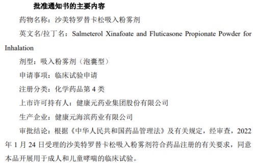 中國粉體網(wǎng)訊 近日,健康元藥業(yè)集團(tuán)股份有限公司收到國家藥品監(jiān)督管理局核準(zhǔn)簽發(fā)關(guān)于沙美特羅替卡松吸入粉霧劑的《藥物臨床試驗(yàn)批準(zhǔn)通知書》。