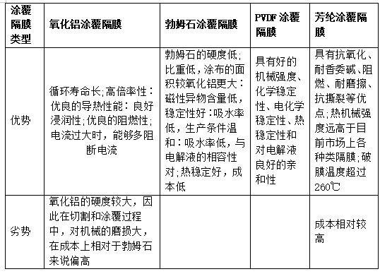 目前濕法隔膜涂覆材料主要為氧化鋁涂層、PVDF涂層、PVDF/氧化鋁混合涂層、氧化鋁+PVDF疊加復(fù)合涂層、勃姆石、芳綸、納米復(fù)合材料等豐富涂層品類。目前市面上主要以勃姆石和PVDF涂覆隔膜為主,氧化鋁和芳綸涂覆隔膜整體因成本太高普及率有限。