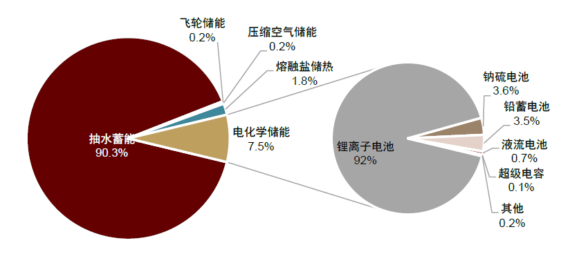 目前抽水蓄能占主導(dǎo)地位,電化學(xué)儲(chǔ)能快速增長(zhǎng)。