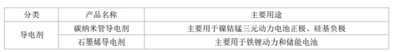 在碳材料方面,公司產(chǎn)品主要為石墨烯導(dǎo)電劑和碳納米管導(dǎo)電劑。導(dǎo)電劑作為鋰電池的一種關(guān)鍵輔材,涂覆于鋰電池正極材料和負(fù)極材料,可以增加活性物質(zhì)之間的導(dǎo)電接觸,提升鋰電池中電子在電極中的傳輸速率,從而提升鋰電池的倍率性能和改善循環(huán)壽命。