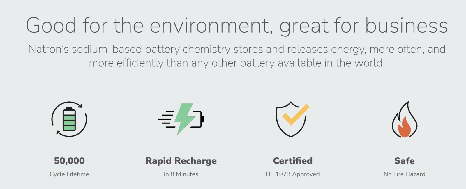 Natron聲稱,它的設計提供了介于鉛酸和鋰離子之間的強大容量功率密度,超高速充電設施可以在8分鐘內完成0-99%充電,循環(huán)使用壽命超過5萬次,比競爭對手鋰離子電池還高出5到25倍。據(jù)說它們的熱穩(wěn)定性非常好,因此運輸、部署和處置都很安全,沒有火災風險。