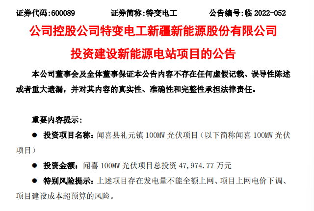 中國粉體網(wǎng)訊 5月16日晚間,特變電工公告稱,為搶抓市場機遇,加快光伏資源的開發(fā),控股公司特變電工新疆新能源股份有限公司(以下簡稱“新能源公司”)擬投資建設聞喜縣禮元鎮(zhèn)100MW光伏項目,投資金額約4.8億元。