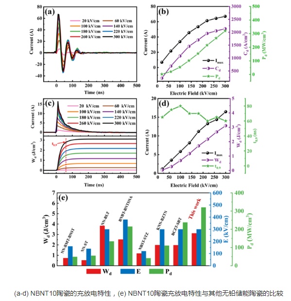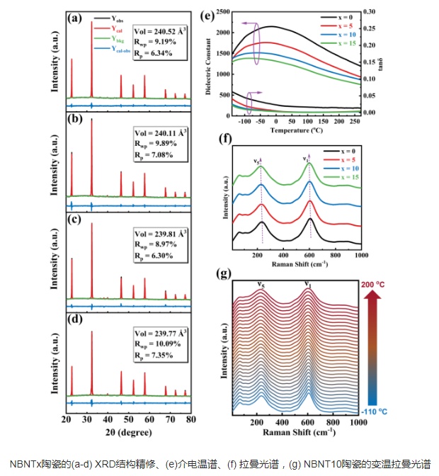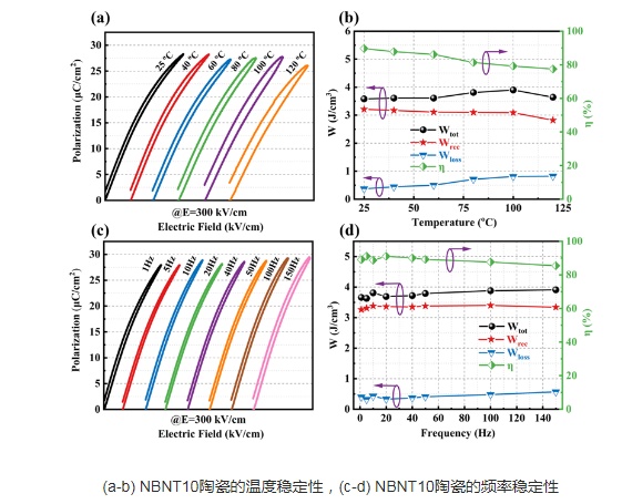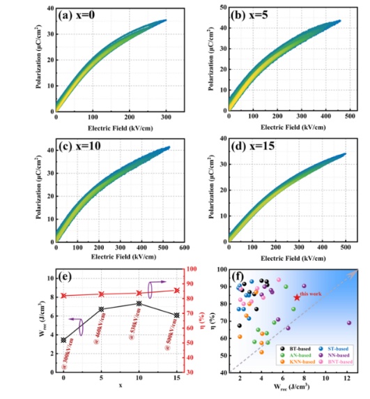 (a-d) NBNTx陶瓷的P-E曲線,(e-f) NBNTx的儲(chǔ)能特性