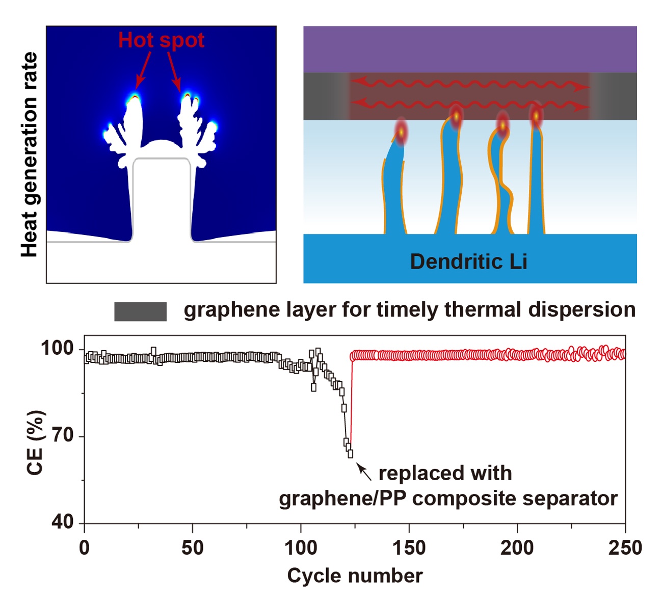這項工作展示了一種基于消除不均勻鋰沉積導(dǎo)致的局部熱積累和溫度熱點的新策略,為解決鋰金屬負(fù)極枝晶問題提供了新思路。該成果近日以“石墨烯熱傳導(dǎo)隔膜消除枝晶生長局部熱點以穩(wěn)定鋰負(fù)極長期循環(huán)”(A Graphene-Coated Thermal Conductive Separator to Eliminate the Dendrite-Induced Local Hotspots for Stable Lithium Cycling)為題發(fā)表于國際權(quán)威期刊《先進(jìn)能源材料》(Advanced Energy Materials)。西安交通大學(xué)化學(xué)工程與技術(shù)學(xué)院為本文第一通訊單位,博士生韓督昭、王曉偉和周亞男為該論文共同第一作者,唐偉教授、解晶瑩總研究師以及劉兆林教授為共同通訊作者。