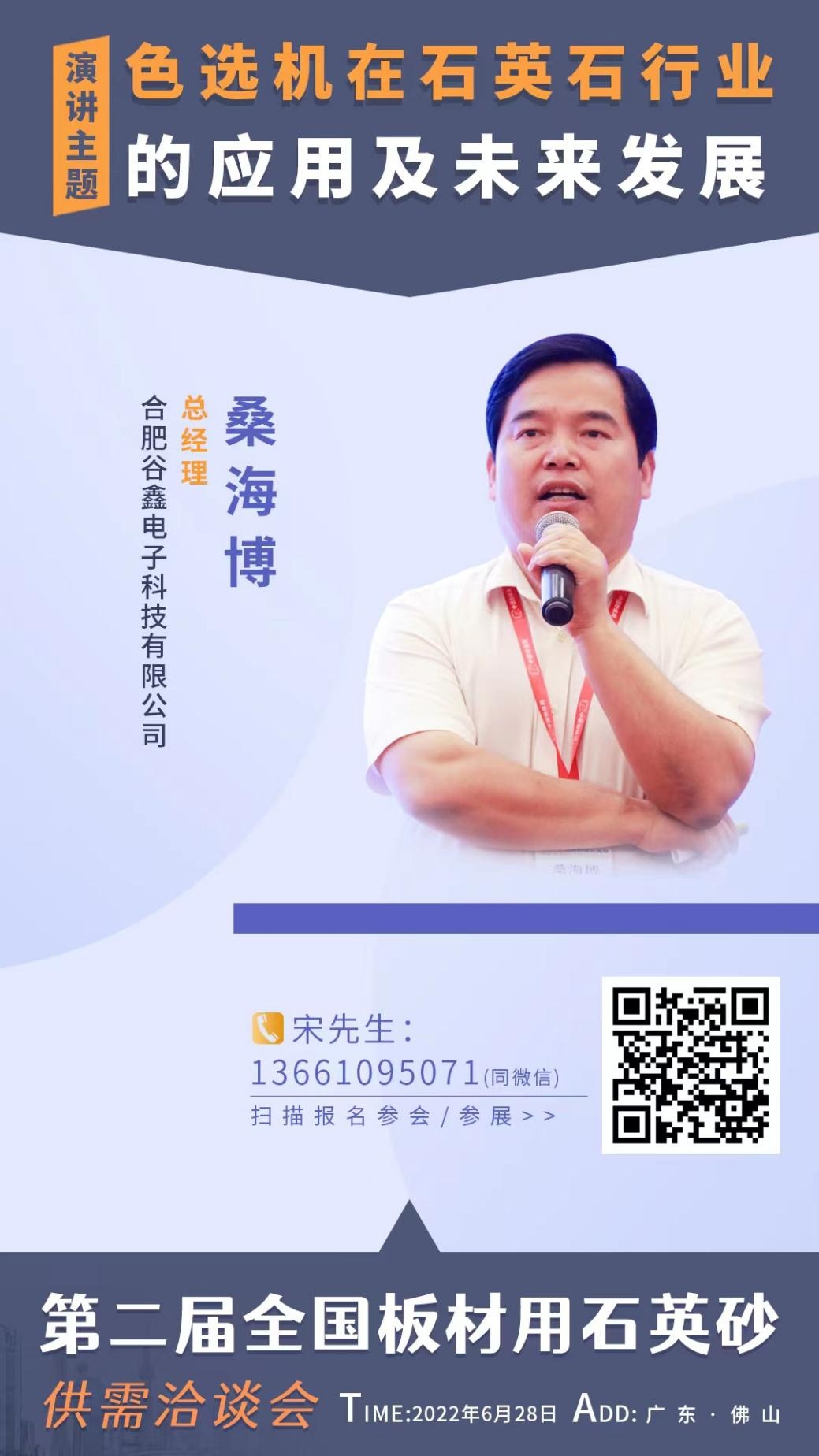 2022年6月28日,中國(guó)粉體網(wǎng)將在廣東佛山舉辦“第二屆全國(guó)板材用石英砂供需洽談會(huì)”。屆時(shí)來(lái)自合肥谷鑫電子科技有限公司的桑海博總經(jīng)理將作《色選機(jī)在石英行業(yè)的應(yīng)用及未來(lái)發(fā)展》報(bào)告,詳細(xì)講述色選機(jī)在石英砂行業(yè)的提純應(yīng)用及發(fā)展現(xiàn)狀、趨勢(shì)。