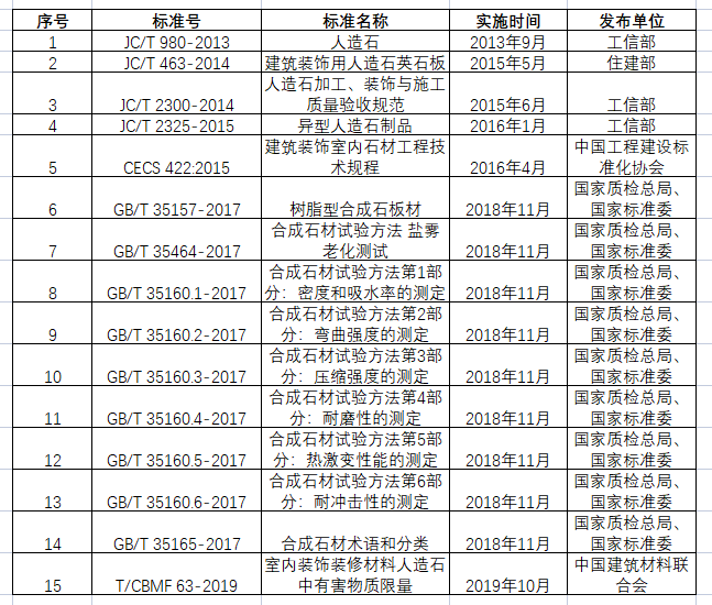 人造石英石行業(yè)標(biāo)準(zhǔn)匯總