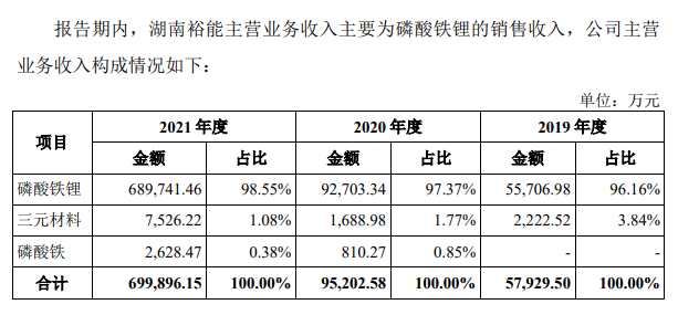 在整體業(yè)績(jī)方面,2019年至2021年,湖南裕能的營(yíng)收分別為5.81億元、9.55億元、70.27億元;凈利潤(rùn)分別為5737萬元、4623萬元、11.75億元。