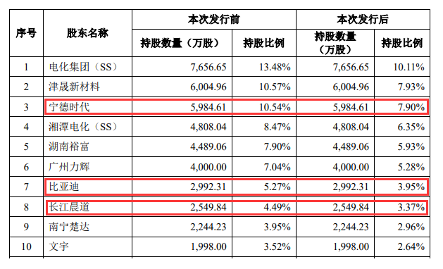 本次發(fā)行前,寧德時(shí)代、比亞迪分別為湖南裕能第三、第七大股東,持股比例分別為10.54%、5.27%。此外,長(zhǎng)江晨道為湖南裕能第八大股東,持股比例約為4.49%。寧德時(shí)代通過其全資子公司寧波梅山保稅港區(qū)問鼎投資有限公司持有長(zhǎng)江晨道15.87%份額,長(zhǎng)江晨道為寧德時(shí)代間接參股企業(yè)。本次發(fā)行后,寧德時(shí)代持有湖南裕能股份比例為7.90%;比亞迪持股比例為3.95%;長(zhǎng)江晨道持股比例為3.37%,股東排名位置不變。