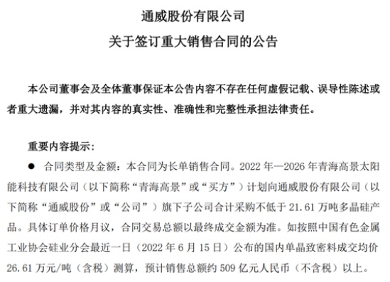 中國粉體網(wǎng)訊 6月18日,通威股份有限公司(以下簡稱“通威股份”)發(fā)布關(guān)于簽訂重大銷售合同的公告。公告稱,2022年—2026年青海高景太陽能科技有限公司(以下簡稱“青海高景”)計劃向通威股份有限公司旗下子公司合計采購不低于21.61 萬噸多晶硅產(chǎn)品。具體訂單價格月議,合同交易總額以最終成交金額為準。