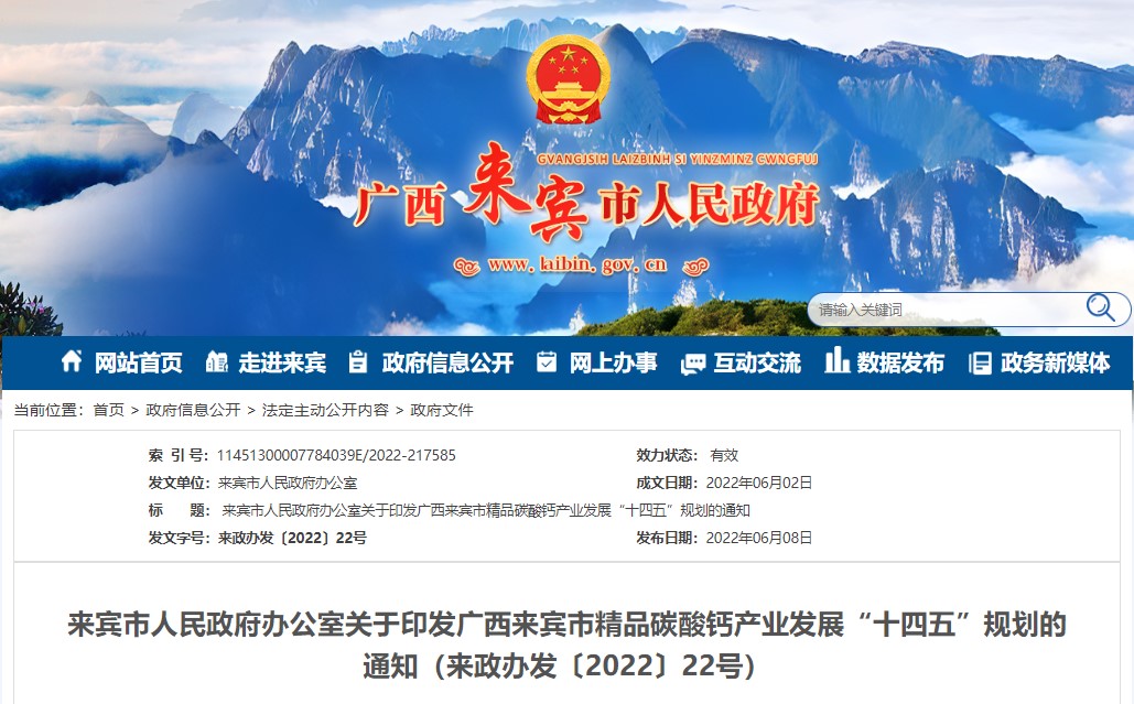 中國(guó)粉體網(wǎng)訊 2022年6月,來(lái)賓市人民政府辦公室印發(fā)了《廣西來(lái)賓市精品碳酸鈣產(chǎn)業(yè)發(fā)展“十四五”規(guī)劃》(來(lái)政辦發(fā)〔2022〕22號(hào)),(以下簡(jiǎn)稱《規(guī)劃》)。