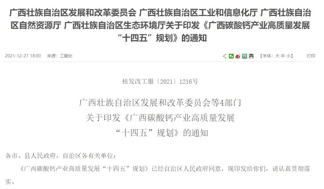 《廣西省碳酸鈣產(chǎn)業(yè)高質(zhì)量發(fā)展“十四五”規(guī)劃》印發(fā)