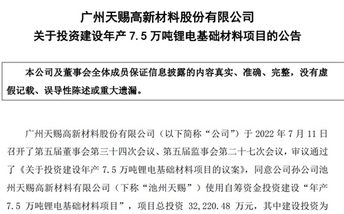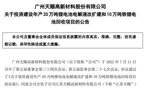 中國(guó)粉體網(wǎng)訊 7月12日,天賜材料連發(fā)兩公告,發(fā)布關(guān)于投資建設(shè)新項(xiàng)目:年產(chǎn)20萬(wàn)噸鋰電池電解液改擴(kuò)建和10萬(wàn)噸鐵鋰電池回收項(xiàng)目,年產(chǎn)7.5萬(wàn)噸鋰電基礎(chǔ)材料項(xiàng)目。
