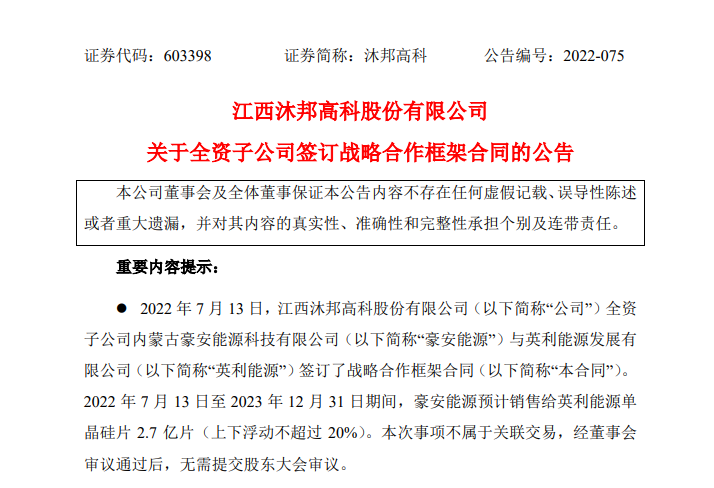 中國粉體網(wǎng)訊 2022 年 7 月 13 日,沐邦高科公告,全資子公司內(nèi)蒙古豪安能源科技有限公司(簡稱“豪安能源”)與英利能源發(fā)展有限公司(簡稱“英利能源”)簽訂了戰(zhàn)略合作框架合同。