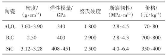 自21世紀以來,防彈陶瓷發(fā)展迅速,種類較多,包括氧化鋁、碳化硅、碳化硼、氮化硅、硼化鈦等,其中以氧化鋁陶瓷、碳化硅陶瓷、碳化硼陶瓷應用最廣。下表為3種陶瓷的特征性能。