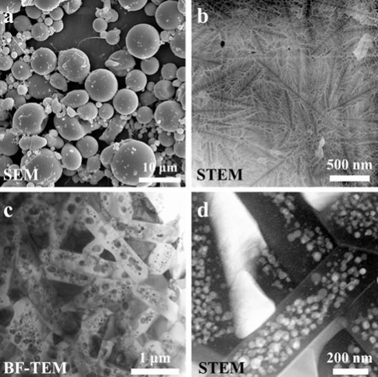 鄭永挺教授項(xiàng)目組首創(chuàng)了“Al-O2超高溫燃燒合成+熔體快速水冷”方法,研制了新型超高溫熔體水冷霧化設(shè)備,合成氧化鋁/氧化鋯亞穩(wěn)態(tài)微米粉(圖a),粉體內(nèi)部微觀結(jié)構(gòu)見(圖b),在燒結(jié)致密化過(guò)程中,原位誘發(fā)了具有高密度多級(jí)氧化鋯納米結(jié)構(gòu)、亞微米柱狀晶的氧化鋁基陶瓷(圖c, d),可實(shí)現(xiàn)多級(jí)納米結(jié)構(gòu)、柱狀晶、氧化鋯t-m相變等多因素的協(xié)同增韌,大幅度提高了陶瓷的力學(xué)性能,產(chǎn)品兼具極高的硬度(HV20GPa)和極佳的韌性(16MPa•m1/2),其技術(shù)原理可廣泛應(yīng)用于高性能先進(jìn)陶瓷的生產(chǎn)制造。