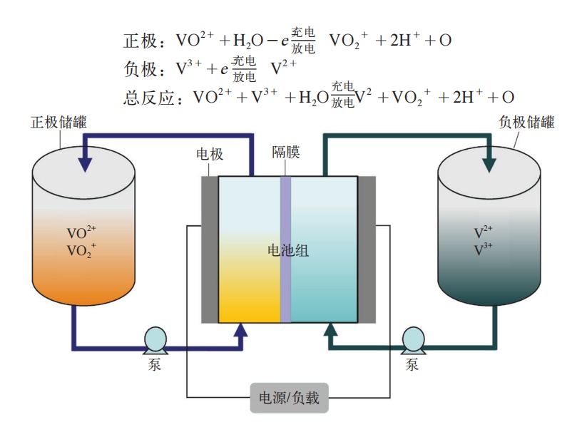 釩電池利用VO2+/VO2+、V2+/V3+兩對氧化還原電堆的釩離子溶液作為正極和負(fù)極的活性物質(zhì),分別儲存在各自的電解液儲罐中。對電池進(jìn)行充/放電時,電解液通過泵的作用,由外部儲液罐分別循環(huán)流經(jīng)電池的正極室和負(fù)極室,并在電極表面發(fā)生氧化和還原反應(yīng),實(shí)現(xiàn)對電池的充/放電。