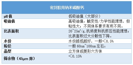 整體而言,影響密封膠專用納米碳酸鈣在密封膠中摻和性能的因素主要是有粒徑、晶型、吸油值、比表面積、pH值、篩余物、水分;影響交替觸變性的因素主要是顆粒形態(tài)、吸油值、表面改性和pH值;影響增強作用的因素主要有∶粒徑、分散性。