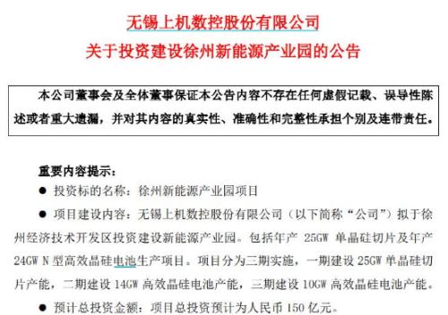 上機數(shù)控公告顯示,公司計劃于徐州經濟技術開發(fā)區(qū)投資建設新能源產業(yè)園,包括年產25GW單晶硅切片及年產24GW N型高效晶硅電池生產項目。據悉,項目分為三期實施,一期建設25GW單晶硅切片產能,二期建設14GW高效晶硅電池產能,三期建設10GW高效晶硅電池產能。其預計總投資金額為150億元。