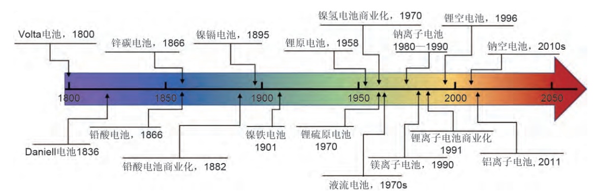 電化學(xué)儲能技術(shù)的發(fā)展歷程(見下圖)最早起于1800年的Volta電池和1836年的Daniell電池(也稱為鋅銅電池)。隨后,鉛酸電池(1882年)、鎳氫電池(1970年)和鋰電池(1990年)不斷涌現(xiàn),實(shí)現(xiàn)商業(yè)化應(yīng)用。