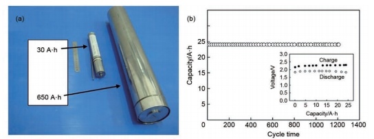 (a,b) 上硅所開發(fā)的30A·h和650 A·h鈉硫單體電池及其循環(huán)性能(圖源:胡英瑛等,《儲能鈉硫電池的工程化研究進(jìn)展與展望》)