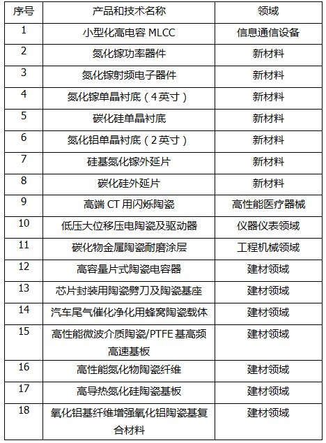 此外,近年來研究及應(yīng)用熱度較高的陶瓷涂層、壓電陶瓷、蜂窩陶瓷、微波介質(zhì)陶瓷、高導(dǎo)熱陶瓷基板等均有相關(guān)材料入選其中。