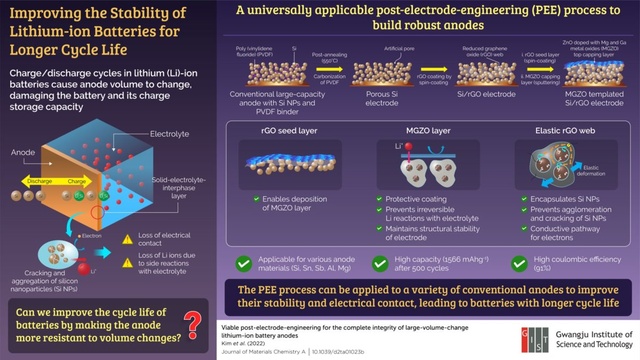為了解決這個(gè)問(wèn)題,韓國(guó)光州科學(xué)技術(shù)院(GIST)的研究人員近期開(kāi)發(fā)了一種創(chuàng)新方法,可以調(diào)整傳統(tǒng)負(fù)極、提高電池的循環(huán)性能,而無(wú)需考慮改變材料或制造方法。