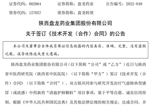 中國(guó)粉體網(wǎng)訊 陜西盤(pán)龍藥業(yè)集團(tuán)股份有限公司(“公司”)近日與陜西省中醫(yī)藥研究院(陜西省中醫(yī)醫(yī)院)簽訂《技術(shù)開(kāi)發(fā)(合作)合同》(“合同”)。雙方擬共同參與研究開(kāi)發(fā)治療氣虛肺熱型感冒(或流感)中藥新藥“清瘟護(hù)肺顆!表(xiàng)目事項(xiàng),基于平等自愿、誠(chéng)實(shí)信用原則,根據(jù)《中華人民共和國(guó)民法典》及其他法律法規(guī)的相關(guān)規(guī)定,達(dá)成合同,并由雙方共同恪守。