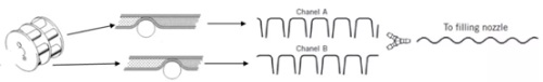 灌裝管路包含泵前進(jìn)液管、泵管和泵后出液管,其中泵管特指在灌裝泵(即蠕動泵)內(nèi)擠壓的一部分軟管,是決定灌裝精度的一個重要因素。每個灌裝泵通常有兩道輥輪,每道輥輪由4-8個滾子組成,每根泵管分別經(jīng)過一道輥輪,形成一個通道,最后兩根軟管匯聚成一個通道,通過兩個通道的波峰波谷疊加來抵消脈沖。灌裝袋出液方式也是影響灌裝精度不穩(wěn)的一個因素,常用的船式和八爪魚式可以滿足均勻地分液。另外倒梯形袋體設(shè)計,可以最大化減少藥液浪費。