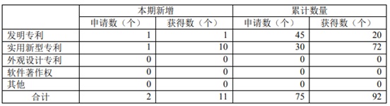 截至 2022 年 6 月 30 日,公司及子公司擁有授權(quán)專利 92 項(xiàng),其中發(fā)明專利 20 項(xiàng),實(shí)用新型專利 72 項(xiàng)。其中,報(bào)告期內(nèi),新增申請(qǐng)發(fā)明專利 1 項(xiàng),實(shí)用新型專利 1 項(xiàng);新增授權(quán)發(fā)明專利1 項(xiàng),實(shí)用新型專利 10項(xiàng)。