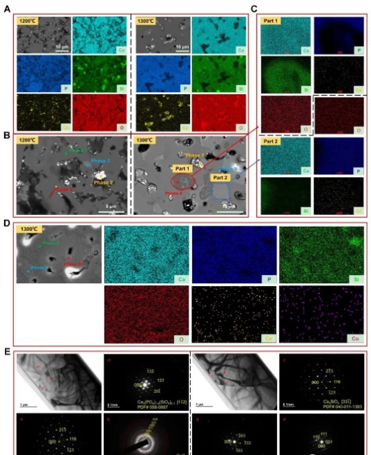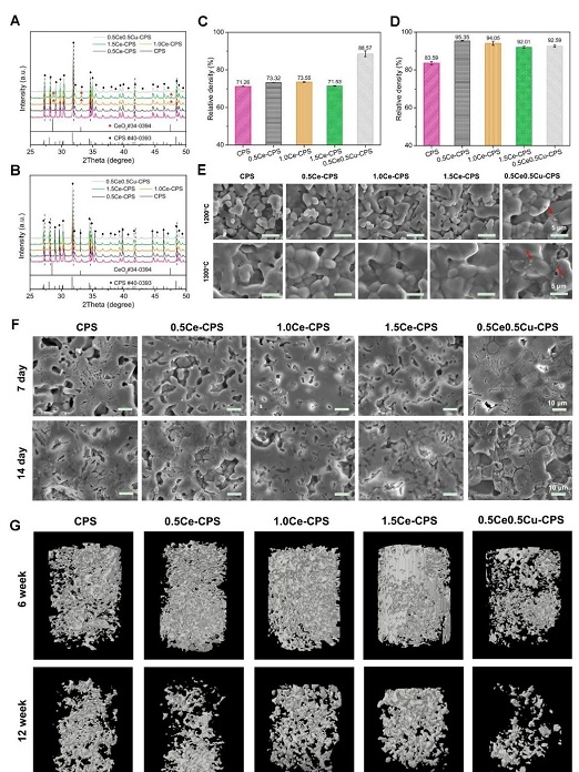一方面,通過在硅磷酸鈣生物陶瓷 (CPS)中摻入不同含量的功能性稀土元素鈰 (Ce)探究其對CPS陶瓷物相組成、微觀結(jié)構(gòu)及降解性的影響,并結(jié)合本課題組之前關(guān)于Cu-CPS的研究結(jié)果 (Biomaterials, 2021, 120553) 進(jìn)一步探究了Ce和Cu的協(xié)同作用效應(yīng)。結(jié)果表明,引入Ce可通過液相燒結(jié)機(jī)制提高CPS陶瓷的燒結(jié)性能,并引起CPS相分離,抑制CPS陶瓷支架的降解速率。相比之下,Ce和Cu共摻的 0.5Ce0.5Cu-CPS 材料既能保持較高的致密度,又能加速CPS的本征降解性,這與晶界處析出的銅氧化物密切相關(guān)。