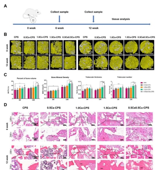 另一方面,生物學(xué)結(jié)果表明Ce有助于促進(jìn)CPS的體外成骨活性,并可通過Cu得到進(jìn)一步優(yōu)化;單一細(xì)胞培養(yǎng)條件下,Ce會表現(xiàn)出明顯的血管抑制效應(yīng),而這種Ce誘導(dǎo)的血管抑制可以通過細(xì)胞共培養(yǎng)方法得到緩解,并可通過Ce-Cu共摻實(shí)現(xiàn)逆轉(zhuǎn)。大鼠股骨髁缺損模型實(shí)驗(yàn)表明,Ce對CPS成骨和成血管的增強(qiáng)作用具有明顯的劑量依賴性,而Cu-Ce共存的0.5Ce0.5Cu-CPS陶瓷表現(xiàn)出最佳的生物活性和良好的生物安全性。