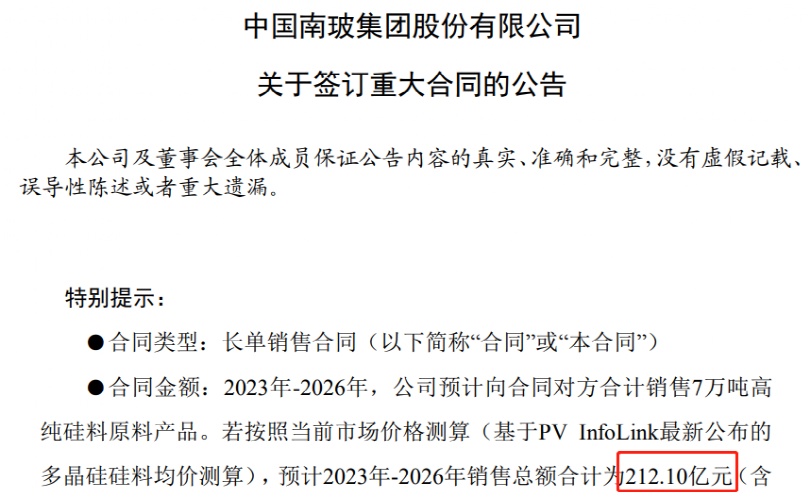 根據(jù)南玻A和天合光能兩家公司的公告,此次銷售協(xié)議屬于長單銷售合同,基于該合同約定,2023年-2026年,南玻A預計向合同對方合計銷售7萬噸高純硅料原料產(chǎn)品。若按照當前市場價格測算(基于PVInfoLink最新公布的多晶硅硅料均價測算),預計2023年-2026年銷售總額合計為212.10億元(含稅)。