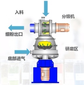 為應(yīng)對日益嚴(yán)峻的節(jié)能減排、低碳環(huán)保的監(jiān)管要求,德國細(xì)川阿爾派經(jīng)過多年的研發(fā)探索,推出了低能耗的干法研磨技術(shù),配以細(xì)川集團(tuán)頂尖的分級工藝,形成簡潔高效的干法微珠攪拌磨工藝,為中高硬度礦物原料的研磨分級提供了新的解決方案。其工作原理圖如下: