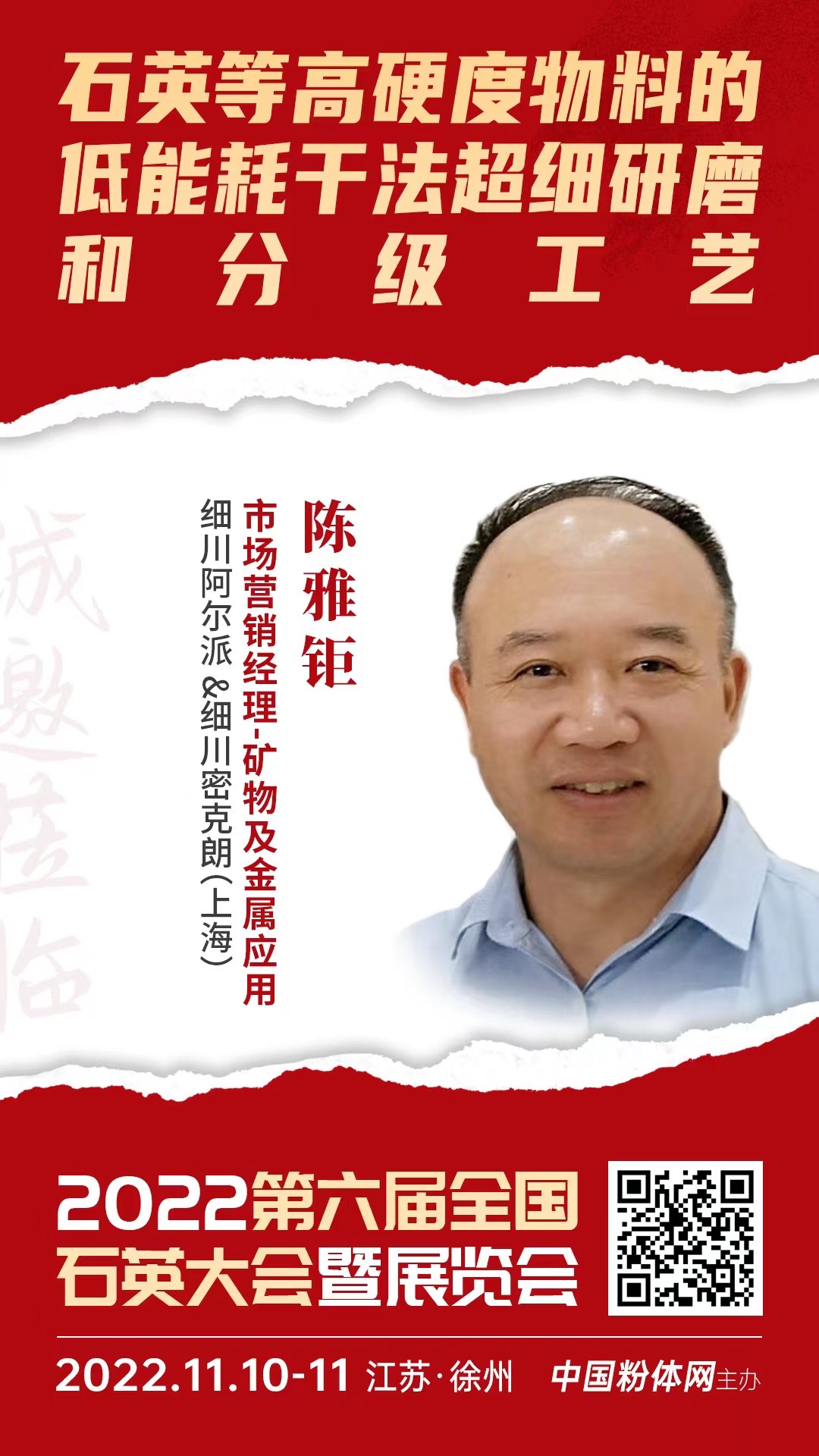 2022年11月10日至11日,中國粉體網(wǎng)將在江蘇徐州舉辦“2022第六屆全國石英大會(huì)暨展覽會(huì)”。細(xì)川阿爾派礦物及金屬應(yīng)用部門的市場營銷經(jīng)理陳雅鉅將代表細(xì)川阿爾派和細(xì)川密克朗(上海)帶來題為《石英等高硬度物料的低能耗干法超細(xì)研磨和分級工藝》的報(bào)告。