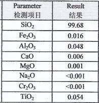 彭亨州關(guān)丹市北部石英砂原礦氧化硅SiO2含量98%以上,氧化鋁0.26%,氧化鐵Fe2O3含量140-500ppm,氧化鈦TiO2200ppm左右,元素鉻Cr540ppm左右,具體元素分析結(jié)果如下。