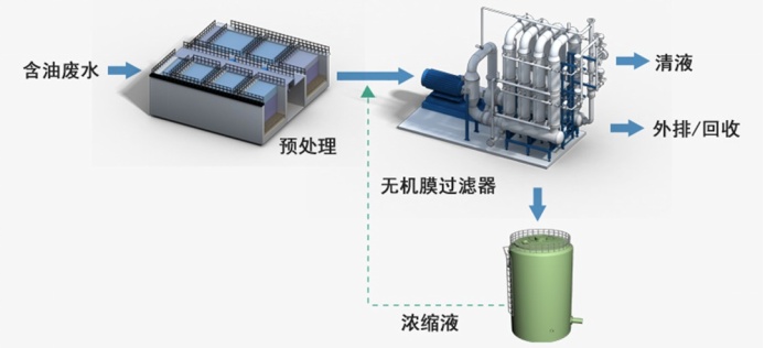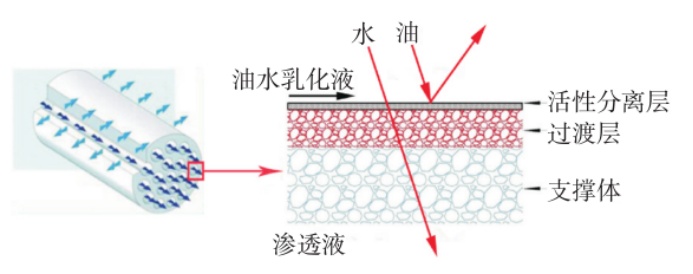陶瓷膜過濾是一種“錯流過濾”形式的流體分離過程,常用于油水分離的微濾膜和超濾膜的膜分離機理一般以篩分原理為主,油粒的分離主要取決于膜孔徑的大小,即原料液在膜管內(nèi)高速流動,在壓力驅(qū)動下分子物質(zhì)(水分子)透過膜,大分子物質(zhì)(油滴)被膜截留從而達到固液分離、濃縮和純化的目的。