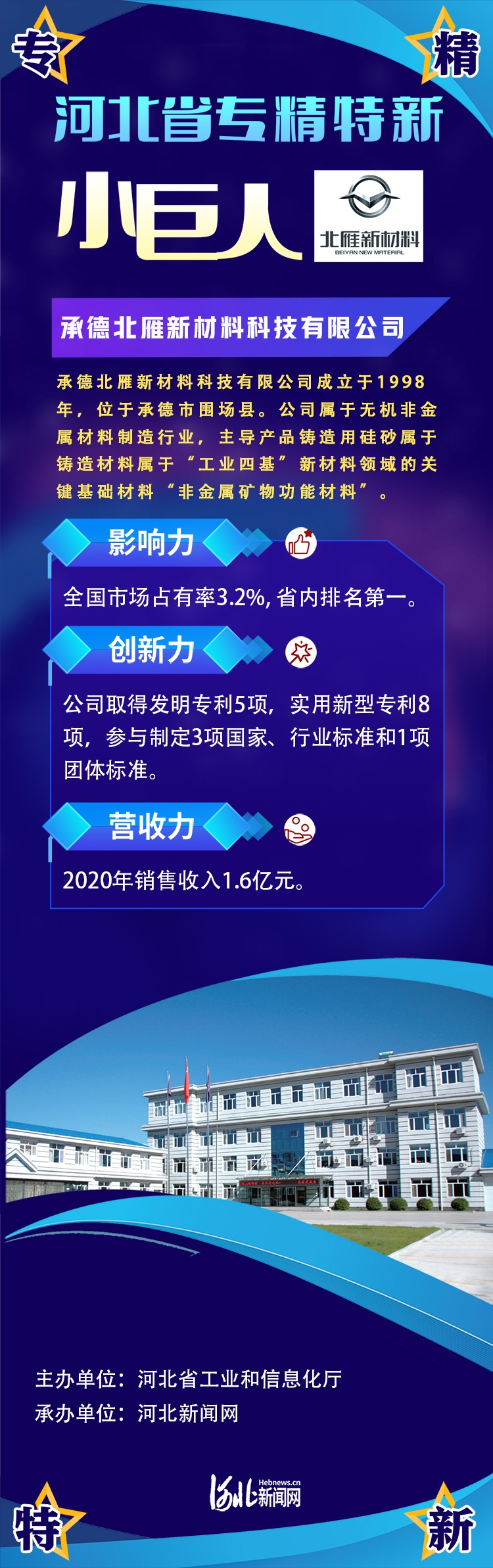 中國粉體網(wǎng)訊 承德北雁新材料科技有限公司(以下簡稱“北雁新材料”)成立于1998年, 注冊資本5200萬元,位于承德市圍場縣。公司屬于無機非金屬材料制造行業(yè),主導產(chǎn)品鑄造用硅砂屬于“工業(yè)四基”新材料領(lǐng)域的關(guān)鍵基礎(chǔ)材料“非金屬礦物功能材料”,在全國市場占有率3.2%, 省內(nèi)排名第一。
